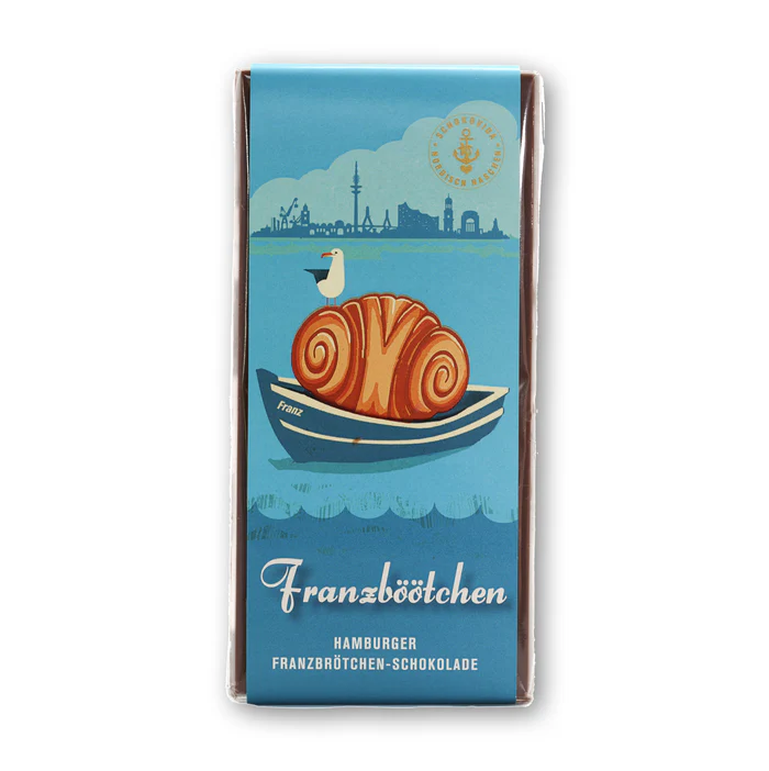 Vollmilchschokolade trifft auf Karamell, Zimt, knusprige Waffelstückchen und eine gute Portion unseres kleinen Betriebsgeheimnisses. Eine Tafel, die die Seele des Franzbrötchens einfängt – und sie mit einem Hauch feiner Vanille abrundet.