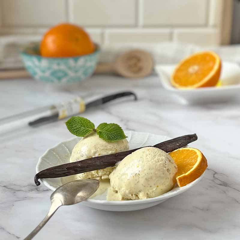 Ein fruchtig leckeres Vanilleeis für die heissen Tage. Das blumige Tahiti-Vanille-Aroma passt wunderbar zu dem fruchtigen  Orangengeschmack. So haben Sie Vanille-Eis garantiert noch nie genossen!