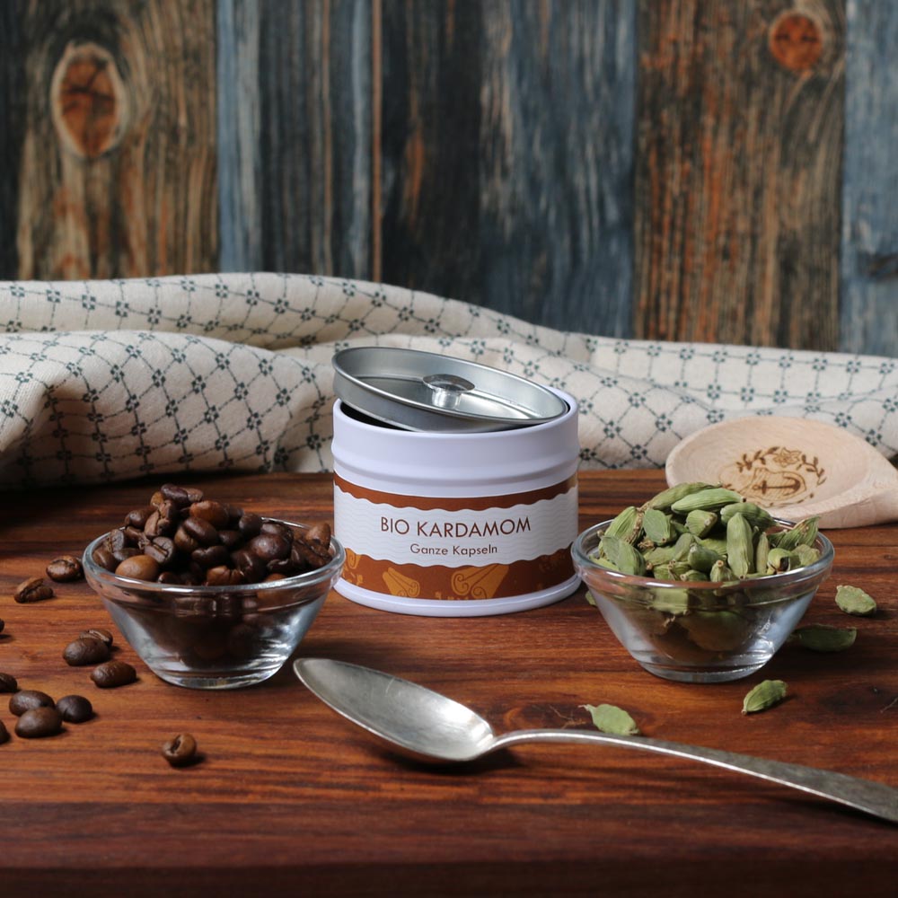 Besonders beliebt: bei herkömmlichen gemahlenem Bohnenkaffee eine Messerspitze frisch gemahlenen Kardamom in das Kaffeepulver mischen oder direkt in den fertigen Kaffee geben.