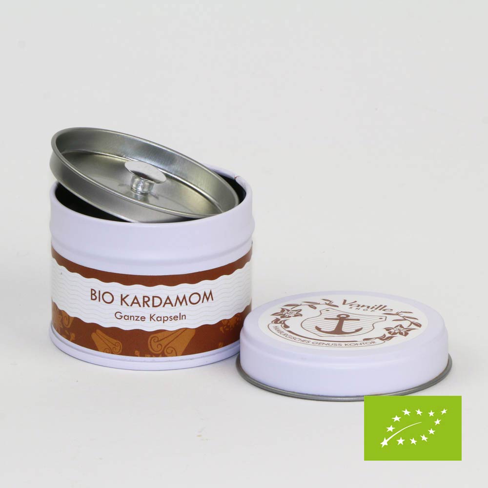 30g Bio Kardamom Kapseln aus k.b.A. in einer dekorativen Vorratsdose mit zweitem Aromaschutzdeckel.