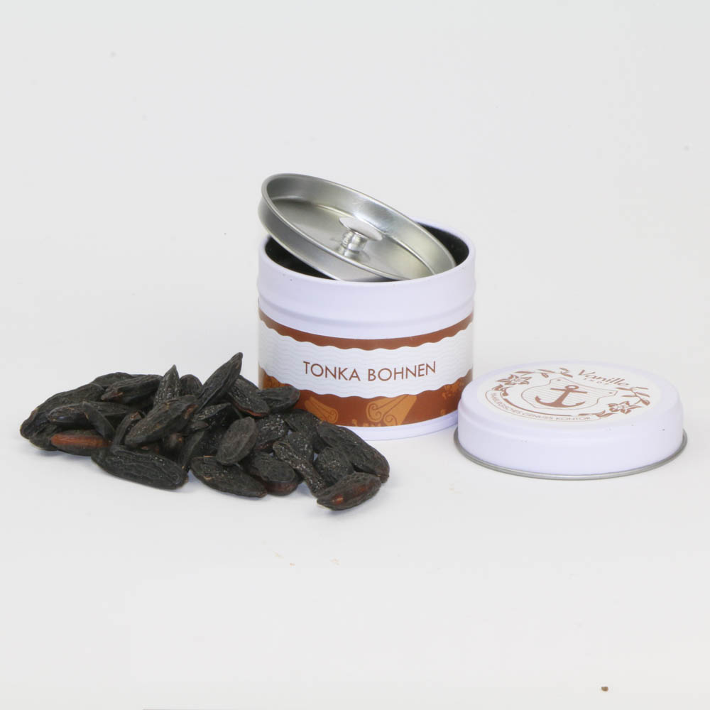 50g Tonkabohnen in einer dekorativen Dose mit zweitem Aromaschutzdeckel.